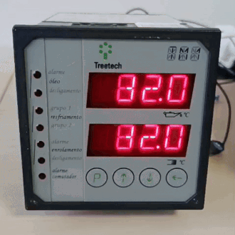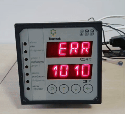 Caso o TM1 detecte variações anormais na leitura — sejam elas decorrentes de mau contato nas conexões do Pt100 ou instabilidades no processo —, o equipamento acionará um alerta visual. O código de autodiagnóstico permanecerá no display até que a irregularidade seja sanada. Recomenda-se a verificação imediata da integridade física do cabeamento e dos conectores do sensor.